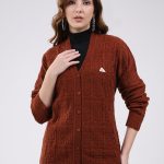 Women Brown Self Design V Neck Full Sleeve Cardigan