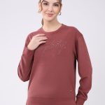 Women Burgundy Embroidered Round Neck Full Sleeve Winter Top