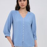Women Blue Printed Front Open 3/4th Sleeve Winter Top